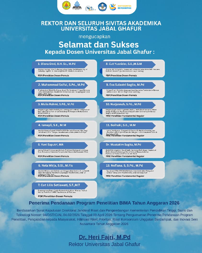 Dosen Universitas Jabal Ghafur Lolos Pendanaan Program Penelitian dan PKM BIMA Tahun Anggaran 2026